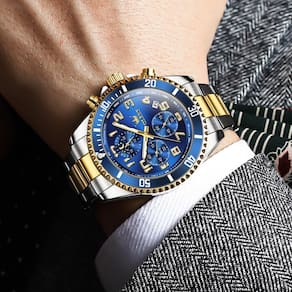 - Relógio azul para homens: bisel giratório unidirecional, o design do cronômetro e multi-agulha aumenta a praticidade do relógio. Design atraente de três olhos, mostrador pequeno e cronometrado, mostrador 24H. A clássica janela inferior da fase da lua é um relógio clássico para homens cavalheiros.