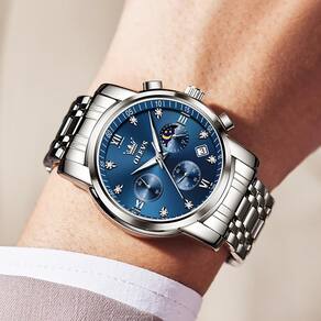OLEVS Relógio masculino azul cronógrafo luxuoso fase da lua grande aço inoxidável à prova d'água luminoso negócios prata relógio de pulso masculino - Relógios OLEVS masculinos: movimento japonês importado, bateria de alta qualidade, relógio romano com mostrador analógico, hora precisa, pode atender a várias necessidades em sua vida diária e trazer comodidade. - Relógio masculino multifuncional: relógio masculino com cronógrafo com três submostradores, mostrando 60 segundos, 60 minutos e uma janela de calendário à direita. O estilo de design é simples, , clássico e generoso. - Relógio de aço inoxidável: pulseira preta de aço inoxidável 316L, relógio de pulso masculino de negócios, ótimo para pulsos grandes, bom relógio de luxo para homens. Ferramenta de ajuste de pulseira de aço inoxidável, o comprimento do relógio de pulso masculino pode ser ajustado de acordo com o tamanho do pulso. - Relógio luminoso/impermeável: 3 ATM à prova d'água atende às necessidades diárias à prova d'água. A função luminosa pode ler o relógio no ambiente escuro. É um relógio essencial para homens maduros. - Relógios OLEVS Moon Phase: devolução de 30 dias e garantia de 12 meses. Se você tiver alguma dúvida sobre o produto, comigo imediatamente e lhe daremos uma solução satisfatória.