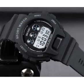 O relógio na imagem é o SKMEI 1775. É um relógio digital esportivo com as seguintes características: Design e Materiais: Possui corpo e pulseira de resina preta ou poliuretano PU , com caixa redonda de plástico ABS. A resistência à água é de 5 ATM, permitindo o uso para natação em águas rasas, mas não para mergulho. Funções: Inclui hora, data, dia da semana, alarme, cronômetro, temporizador, formato de 12/24 horas e luz de fundo LED de cor verde. Peso e Dimensões: Pesando cerca de 43 gramas, é considerado leve e confortável. O diâmetro do mostrador é de 45mm e a espessura é de 16mm. Cor da caixa: Preto. Cor do bisel: Preto. Material da correia: Resina. Cor da correia: Preto. Resistente à água. Acompanhe qualquer ocasião Marca: Não Informado