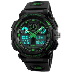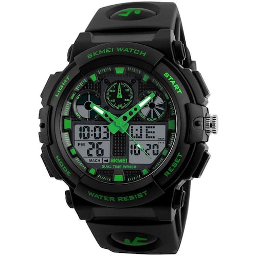 Descrição: - O display digital e analógico facilita muito a contagem das horas. - Função de alarme, exibição de dia e data. - A luz de fundo permite que você saiba a hora claramente no escuro. - Cronógrafo de 1/100 segundo. - Resistente à água até 5 ATM. Especificações: - Tipo de tela: LCD e analógico - Diâmetro da caixa do relógio: 2,0" - Espessura da caixa: 0,7" - Comprimento da pulseira (caixa incluída): 9,8" - Largura da pulseira: 1,2" - Material da pulseira: borracha - Material da caixa: plástico