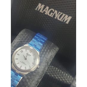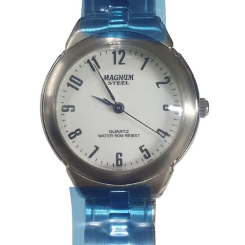 Marca: Magnum -modelo: MA28396Q -gênero: Unissex -coleção / Linha: Slim -tamanho: Pequeno -cor do mostrador: Branco com marcadores Em Prata e Ponteiros - Sistema de energia : Bateria - Tampa posterior : Rosqueado - Resistência à água : 5 metros - não indicado para natação e mergulhos - Vidro : Cristal Mineral resistente a arranhões - Material da caixa : Aço inoxidável - Material da pulseira : Aço inoxidável Medidas : - Diâmetro da caixa : 2,7 cm - Diâmetro do visor : 2,1 cm - Espessura da caixa : 0,9 cm - Peso: 49 g Acompanha: Manual em Português + + Embalagem .