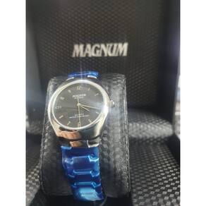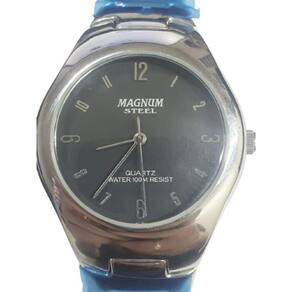 Marca: Magnum -modelo: MA28458T -gênero: Unissex -coleção / Linha: Slim -tamanho: Pequeno -cor do mostrador: Preto com marcadores Brancos e Ponteiros - Sistema de energia : Bateria - Tampa posterior : Rosqueada - Resistência à água : 100 metros - não indicado para natação e mergulhos - Vidro : Cristal Mineral resistente a arranhões e antirreflexo - Material da caixa : Aço inoxidável - Material da pulseira : Aço inoxidável Medidas : - Diâmetro da caixa : 3,3 cm - Diâmetros do visor : 2,7 cm - Espessura da caixa : 0,9 cm - Peso: 88 g Acompanha: Manual em Português + + Embalagem .