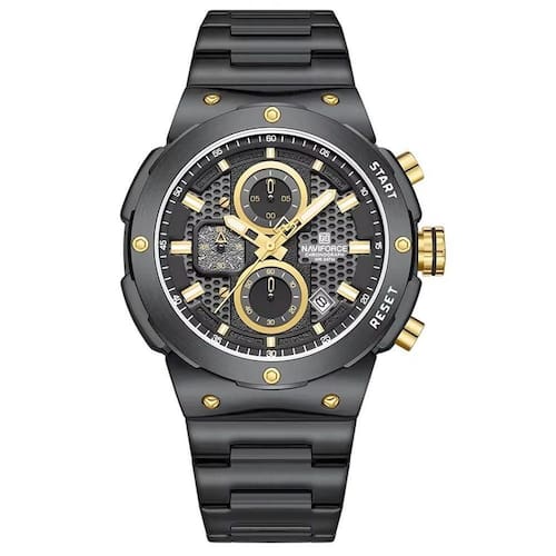Especificações: [Resistência:] Feito para aguentar as mais diversas aventuras, este relógio é à prova d'água até 3Bar, ideal para entusiastas de esportes aquáticos e ambientes úmidos. [Design robusto:] Equipado com material resistente a choques e vidro Hardlex, protege contra arranhões, mantendo seu visual sempre impecável. [Funcionalidade aprimorada:] Oferece um calendário completo e função de alarme, garantindo que você nunca perca um compromisso importante. [Elegância e conforto:] Pulseira de aço inoxidável com largura entre 20 e 24 mm, oferece um ajuste confortável e seguro, complementando seu estilo com um toque de luxo. [Precisão:] Com movimento de quartzo confiável, proporciona uma cronometragem precisa, indispensável para aqueles que vivem uma vida dinâmica.