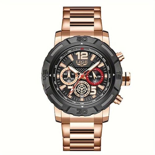 Relógio De Quartzo Masculino Em Aço Inoxidavel Design Esportivo á Prova D´agua Rosa Preta
