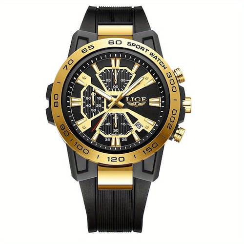[Pulseira de silicone inovadora] que não só garante um ajuste confortável, mas também é altamente resistente, adaptando-se perfeitamente ao seu pulso em qualquer situação.[Caixa de liga de zinco robusta] que traz uma durabilidade impressionante, aliando leveza e estrutura sólida em um design moderno e sofisticado.[Funcionalidade à prova d'água] permite que você use o relógio em diversas situações sem preocupações, seja na prática de esportes ou em um dia chuvoso.[Estilo Business versátil] que serve para completar um look formal ou casual, sendo uma peça chave no guarda-roupa de qualquer pessoa que prima por elegância.[Cronógrafo esportivo estiloso] oferece precisão temporária para suas atividades, mostrando que você pode ser sempre pontual com muito estilo e precisão.