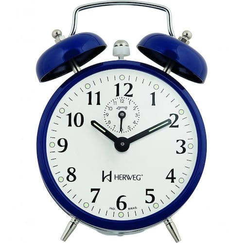 Relógio Despertador Antigo Mecânico De Metal A Cordas Azul Herweg 2208-011 único Relógio Despertador Antigo Mecânico de Metal A Cordas Azul Herweg 2208-011 único - Características Gerais do Produto: Acabamento / funcionalidades: Azul Escuro Alimentação: A corda Características técnicas: Mecânico; Alarme com som campainha; Ponteiros com massa luminosa; Mostrador fosforescente Material: Metal pintado; Visor de Acrílico; Detalhes cromados Medidas: 14A x 9L x 6E cm Observações: Botões de regulagem na parte traseira e na parte superior do produto. Modelo referência do produto: 2208-011 Acompanha o produto: 01 Relógio Despertador Eletrônica Garantia de 12 meses do Fabricante Embalagem Manual de Instruções Garantia: 12 Meses de Garantia de