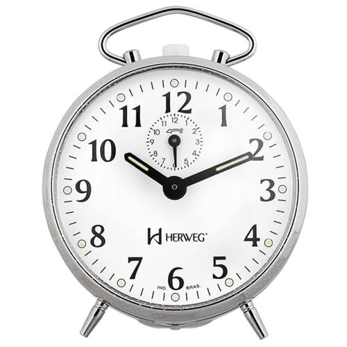 Despertador Mecânico - 2210 Estilo: Clássico Medidas: Altura do relógio: 10 cm com alça levantada 11,8 cm Largura do relógio: 10 cm Espessura do relógio: 4,3 cm com botões traseiros 5,5 cm Características Técnicas: Alarme com som campainha Funcionamento Mecânico Cores Disponíveis: Prata Cromado Mais Informações sobre o produto Relógio Despertador Mecânico a cordas Base em Metal Visor de acrílico Ponteiro com massa luminosa Noturna Mostrador com massa luminosa Noturna Botões de regulagem na parte traseira Ean: 7897280314681
