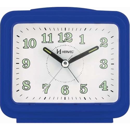 Relógio Despertador Quartz Herweg som alto Azul 2588-011 Alarme sonoro, som bem alto, ao estilo daqueles antigos de corda Ponteiros refletivos no escuro Mecanismo step com tic-tac Base: Plástico injetado Usa 2 pilhas AA Medidas: 11cm Largura x 9,5cm Altura x 6cm Espessura Modelo: 2588-011 - Azul Escuro