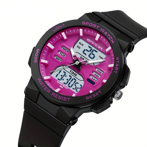 Relógio desportivo unissex com ecrã duplo, cronómetro e luz noturna LED - preto e rosa
