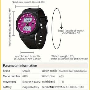 O Relógio Desportivo Unissexo SANDA é uma fusão de estilo e funcionalidade, projetado para aqueles que valorizam tanto a moda quanto a praticidade no seu dia a dia. Com um mostrador azul vibrante decorado com marcadores brancos, este relógio é a companhia perfeita para fitness, caminhadas ou uso casual. Equipado com um cronómetro e iluminação noturna LED, ele oferece precisão e visibilidade em qualquer situação, garantindo que você nunca perca um momento.
