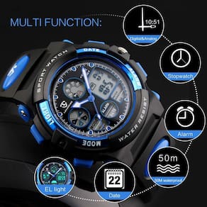 ? Design multifuncional: display digital, luz de fundo LED, data, 12/24 horas, alarme, cronômetro, 50 m à prova d'água. Ótimo presente de aniversário e Natal para as crianças. (Atributo de idade do fabricante: crianças com mais de 3 anos)