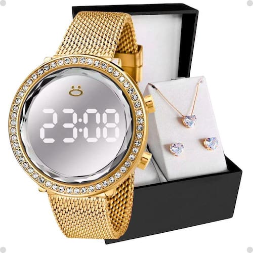 Relogio digital aço feminino + caixa + colar brinco strass Kit Maria Premium - Relógio Orizom Maria + Colar e Brincos Banhados