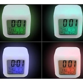 Possui mudança automática de 7 cores (LED) diferentes e você pode desligar quando quiser, marca a hora; data; semana; temperatura e também funciona como luminária.