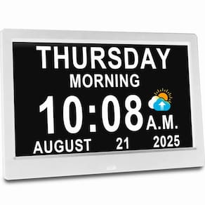 - & & : Relógio digital HD autêntico de 29.2 cm 1280 x 800 Fala (inglês) hora, dia da semana e data, fornecendo anúncios de voz claros sem qualquer problema de audição! Backup com um controle remoto prático. Um organizador confiável para idosos com demência ou crianças em idade escolar