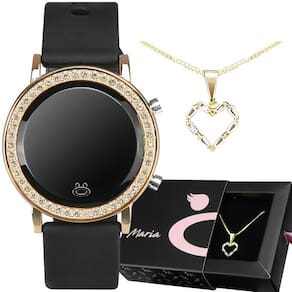 Kit Luxo Maria - Relógio Digital Orizom Maria Preto com Detalhes Dourados + Colar Banhado 18k com Pingente de Coração + Caixa PremiumEste kit exclusivo oferece o equilíbrio perfeito entre sofisticação e modernidade. Surpreenda alguém especial com o relógio digital feminino Orizom Maria, em preto com detalhes em dourado e strass, confeccionado em aço inox banhado e com pulseira em silicone para conforto duradouro. Acompanha também um colar banhado em 18k, com pingente em forma de coração e strass, apresentado em uma elegante caixa premium Orizom Maria para armazenar com estilo.Com um design elegante e luxuoso, o relógio Orizom Maria possui um diâmetro aproximado de 4cm, garantindo um ajuste confortável e cheio de estilo. O colar banhado 18k complementa o kit, proporcionando um brilho encantador com o pingente em forma de coração.Este kit é indicado para presentear adolescentes e mulheres que apreciam peças refinadas e modernas. Ideal para ocasiões especiais, esse presente inesquecível une a beleza do relógio digital com a elegância do colar banhado, proporcionando um toque de luxo e sofisticação.Surpreenda alguém especial com este kit exclusivo que reflete o bom gosto e a atenção aos detalhes.
