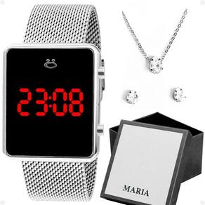 Relogio Digital Feminino Prata + Brincos + Caixa + Colar