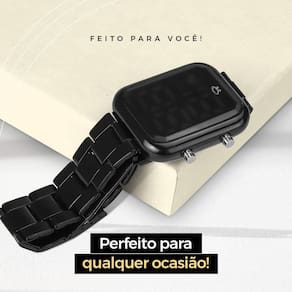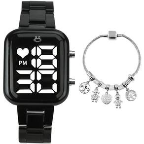 Relogio Digital Feminino Preto + Pulseira Pandora Casual Kit de Presente Orizom Maria - Relógio Feminino Digital e Pulseira Aproveite a oportunidade de presentear a pessoa amada com o Kit de Presente Orizom Maria! Este kit contém um elegante Relógio Feminino Digital da linha Orizom Maria, com um design quadrado e cor preto (Black Piano) feito de aço inoxidável e uma pulseira estilo Pandora de cor prata, também feita de aço inoxidável, com aproximadamente 21 cm de comprimento.