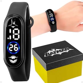 Design Moderno: Relógio digital no estilo bracelete, ideal para o uso diário. Seu design discreto e todo preto é perfeito para os fãs do Batman, proporcionando um visual moderno e divertido.