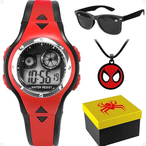 "Kit Infantil Homem-Aranha - Relógio Digital, Óculos, Colar e Caixa Premium"Adquira já este incrível kit infantil do Homem-Aranha e proporcione momentos incríveis para o seu filho! O kit é composto por:- Relógio Infantil Digital: Com design vermelho e preto e luz de LED, é perfeito para facilitar a visualização das horas no escuro. Resistente e ajustável, é ideal para o dia a dia das crianças.- Óculos Infantil: Com armação e hastes em acetato preto e lentes pretas com proteção UV, o visual do Homem-Aranha aplicado à armação completa o estilo do seu pequeno fã.- Colar Infantil: Feito de elástico resistente, ajustável e com pingentes exclusivos do Homem-Aranha, é o acessório perfeito para acrescentar um toque de personalidade ao visual.- Caixa Premium: Com o símbolo do Homem-Aranha recortado a laser, a caixa de alta qualidade torna o presente ainda mais especial e memorável.Este kit é ideal para presentear seu filho ou para se presentear. Não perca a chance de adquirir um produto exclusivo e de alta qualidade! Aproveite agora mesmo!
