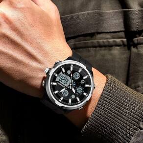 Projetado para o homem moderno que busca desempenho e estilo. Com movimento de quartzo de alta precisão, este relógio oferece resistência à água, tornando-o ideal para atividades ao ar livre e esportes. Possui um design robusto e elegante, com uma pulseira confortável e durável, além de recursos como cronômetro e iluminação noturna para garantir visibilidade em qualquer condição. Perfeito para quem valoriza funcionalidade e estética em um só acessório.