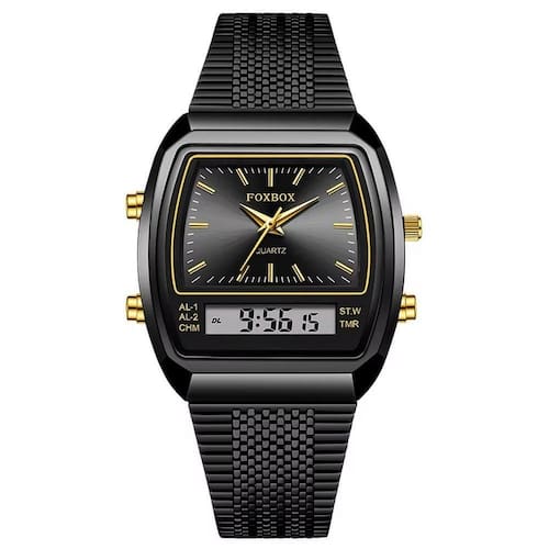 Cada detalhe foi cuidadosamente pensado para atender às suas necessidades. Equipado com uma tela de LED que oferece clareza incomparável, mesmo em condições de baixa luz, e um revestimento à prova d'água que garante proteção até 3 Bar de profundidade. A pulseira de aço inoxidável não só proporciona um ajuste confortável, mas também exala uma durabilidade excepcional. Este relógio de moda não é apenas um acessório, mas sim, um símbolo de sofisticação para o homem atual.