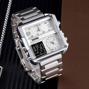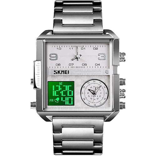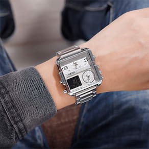Relógio Multifuncional Militar Mens importado- Mostrador de exibição triplo fresco exclusivo com cronômetro e alarme e data e formato de 12/24 horas, mostrador facial grande LED com a clássica banda de couro ou banda de aço inoxidável, simples e grandioso, expressivo do seu sabor extraordinário Digital Sports Watch: Movimento de quartzo de alta qualidade com tela analógica de três fusos horários, três fusos horários de trabalho é muito conveniente para viajar. Design de discagem esportiva da moda, Mostrador Grande e números com luz, mostram o tempo claro no escuro Confortável e Durável: A faixa de couro Superior que é macia e respirável; a banda de aço inoxidável é clássica e durável, ótima para o uso diário e proporciona uma experiência maravilhosa de desgaste. Perfeito para atividades internas e externas Relógio impermeável para uso diário: 3 ATM À prova d'água: Lavagem das mãos, Dia da Chuva, Sudorese, SEM Problema. NÃO é adequado para mergulho, natação, snorkeling, trabalho relacionado à água Bom Presente para Men Boys: Seu design especial de moda leva você à beira da moda esportiva. Um presente perfeito para famílias e amigos no Natal, Ação de Graças, Dia dos Pais. Adequado para homens ou qualquer um que gosta de relógio de discagem grande deve amar este relógio esporte de moda