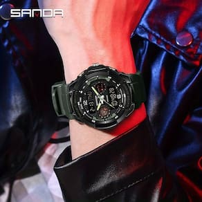 Este relógio esportivo é mais que um simples acessório - é um companheiro essencial para qualquer homem ativo que leva sua saúde e estilo a sério. Com um design robusto e funcional, este relógio de pulso SANDA traz uma combinação insuperável de tecnologia e resistência. Feito com uma pulseira de borracha confortável e uma caixa de resina sintética durável, ele é perfeitamente adequado para aventuras ao ar livre e atividades intensas. Sua resistência à água até 50m garante confiabilidade mesmo nas condições mais extremas, enquanto o display duplo e o movimento eletrônico digital oferecem precisão e legibilidade excepcionais.