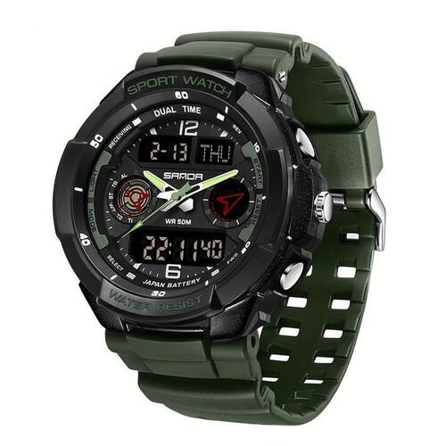 Recursos e Benefícios: [Resistência à água] até 50m: Nunca se preocupe em tirar o relógio para atividades aquáticas. Este relógio esportivo foi projetado para suportar até 5 ATM, garantindo durabilidade e desempenho em ambientes úmidos e aquáticos.[Display duplo, digital] e analógico: Combine o melhor dos dois mundos com um display que oferece a elegância do analógico e a funcionalidade do digital. A leitura rápida e clara das horas garante que você nunca perca um segundo, mesmo nas corridas mais intensas.[Pulseira de borracha] confortável: Desfrute de um ajuste perfeito e confortável, ideal para usos prolongados. Esta pulseira é resistente ao suor e aos impactos, proporcionando máxima durabilidade e conforto em qualquer situação esportiva.[Função de data] prática: Mantenha-se organizado e pontual com a função de data integrada. Nunca mais se perca nos seus compromissos, mantendo tudo visível e de fácil acesso com apenas um olhar.[Luz noturna] para visibilidade: Aumente sua capacidade de ver as horas mesmo no escuro. A luz noturna embutida é perfeita para corredores noturnos, acampamentos e qualquer atividade em baixa luminosidade, garantindo que você tenha controle total sobre suas métricas a qualquer hora do dia.
