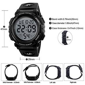 Destaques: * Relógios esportivos masculinos totalmente pretos, fáceis de ler, tanto na hora quanto no calendário, com face grande * Movimento digital japonês , fornecem cronometragem precisa e precisa * O vidro de resina de alta dureza protege você da luz diária * Resistente à água de 5 ATM, adequado para uso diário e diferentes tipos de esportes e atividades ao ar livre e em ambientes fechados, como nadar, lavar, tomar banho * Cronômetro, compatível com cronógrafo de 1/100 segundo * Bateria japonesa de 2 anos de vida útil, mantém tempo preciso em muito tempo Características: * Mostrador eletrônico de luz de fundo LED * Cronógrafo * Calendário com data e dia (semana) * Alarme * Superfície espelhada resistente a arranhões * 5 ATM Impermeável: 164 pés/50 m Material resistente à água: * Movimento: movimento digital japonês * Caixa do relógio: silicone * Parte traseira do relógio: aço inoxidável * Pulseira do relógio: silicone * Superfície do espelho: vidro de resina * Fecho: aço inoxidável * Tipo de fecho: fivela de pino Especificação: * Cor do mostrador: preto * Diâmetro da caixa do mostrador: 1. 85 polegadas/4,7 cm * Espessura da caixa do mostrador: 0,47 polegadas/1,2 cm * Cor da pulseira: preta * Largura da pulseira: 0,79 polegadas/2 cm * Comprimento da pulseira: 10,04 polegadas/25,5 cm ( (incluindo o estojo) * Cor do fecho: prata * Peso do relógio: 0,14 lb/63 g