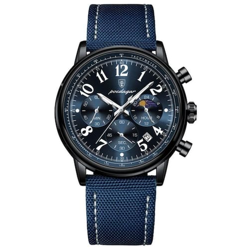 Especificações [Design Moderno]: O mostrador apresenta marcadores de algarismos arábicos que conferem um toque contemporâneo e fácil leitura, ideal para o cotidiano agitado. [Durabilidade Excepcional]: Com espessura de 13mm e um estojo feito em aço inoxidável, este relógio é construído para durar e resistir a desafios. [Funcionalidades Avançadas]: Equipado com cronógrafo, mãos luminosas e data automática, este relógio é mais que um acessório; é um gadget indispensável. [Resistência à Água]: Com resistência de até 3 Bar, este relógio é um verdadeiro companheiro em atividades aquáticas, seja na piscina ou no mar. [Estilo Incomparável]: Feito com pulseira de náilon de alta qualidade, proporciona uma estética esportiva enquanto mantém o conforto e a durabilidade.