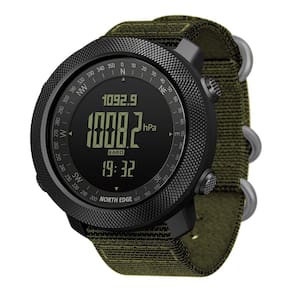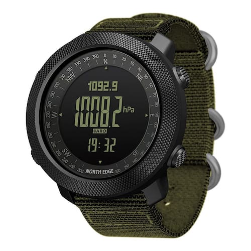 - ++ Vida útil da bateria: 18 meses+Resumo da função: bússola, altímetro, barômetro, termômetro, previsão do tempo, hora mundial, hora dupla, pedômetro, caloria, registro de distância, alarme de 2 conjuntos, cronômetro, luz de fundo EL.
