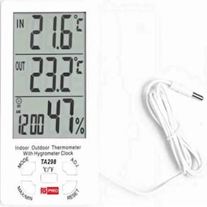 Termômetro e Higrômetro Digital 3 em 1 TA298Controle Total do Seu Ambiente!O Termômetro e Higrômetro Digital TA298 é a solução perfeita para monitorar a temperatura e a umidade do seu espaço com precisão e facilidade. Compacto e funcional, este dispositivo é ideal para uso doméstico, garantindo o controle ideal do clima em sua casa.Características Principais:Medida de Temperatura e Umidade: O TA298 combina a medição de temperatura interna e externa com a exibição simultânea da umidade, oferecendo um controle completo do ambiente.Faixas de Medição:Temperatura Interna: -10C a +50C (14F a 122F) com precisão de 1,0C.Temperatura Externa: -50C a +70C (-58F a 158F) com precisão de 1,0C.Umidade: 20% RH a 99% RH com precisão de 5%.Recursos Adicionais:Exibição Digital LCD: O display grande e claro facilita a leitura das medições, tornando a operação prática.Função de Memória: Monitore as temperaturas e umidades máximas e mínimas, com a opção de limpar a memória quando necessário.Design Compacto: Pequeno e leve, o TA298 é fácil de transportar e ideal para qualquer ambiente.Cabo com Sonda: Permite a medição precisa da temperatura e umidade externa, ampliando sua funcionalidade.Especificações Técnicas:Temperatura interna: 0C a 50C (32F a 122F)Precisão da Medição de Temperatura: 1C (2F)Resolução de Temperatura: 0,1C (0,1F)Umidade: 10% a 99%Precisão da Medição de Umidade: 5%Resolução de Umidade: 1%Alimentação: 1 bateria AAA (não inclusa)Cor: BrancoTamanho: 150 x 88 x 25 mmTamanho do LCD: 66 x 92 mmOperação:Conversão de Temperatura: Pressione o botão C/F para alternar entre Celsius e Fahrenheit.Visualização Máxima/Mínima: Pressione MAX/MIN para exibir as temperaturas e umidades máximas e mínimas. Pressione CLEAR para limpar a memória.Configuração de Tempo e Alarme: Ajuste o formato de 12/24 horas e configure alarmes com os botões ADJ e MODE.Nota Importante: Se o display parecer borrado, substitua a bateria para garantir uma leitura precisa.Pacote Inclui:1 x Termômetro e Higrômetro Digital TA2981 x Manual do UsuárioExperimente a precisão e praticidade do TA298 e mantenha seu ambiente sempre na condição ideal! Com este dispositivo, você estará sempre no controle do clima da sua casa.