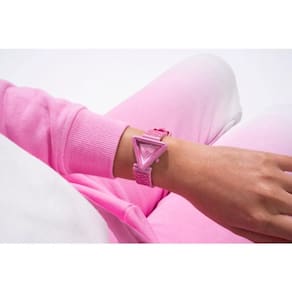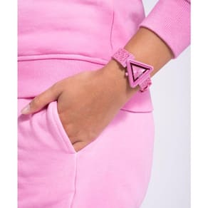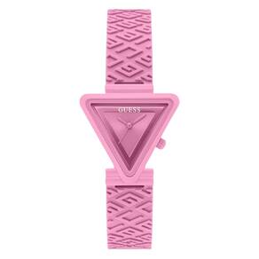 Relógio feminino GUESS de 34 mm — Pulseira rosa com mostrador rosa — Estojo rosa de nylon sustentável de 34 mm — Mostrador rosa sol — Pulseira de silicone texturizada rosa — Analógica de quartzo com 3 ponteiros — Resistente à água até 10 metros — pulseira rosa de 7,5 polegadas