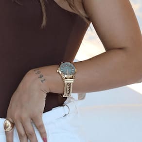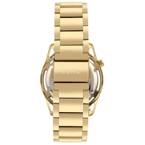 Sua caixa em metal dourado apresenta linhas robustas e acabamento polido, conferindo presença e estilo ao pulso feminino. O mostrador dourado mantém uma leitura equilibrada e harmoniosa, com ponteiros bem definidos e layout clean, valorizando o conjunto sem excessos.