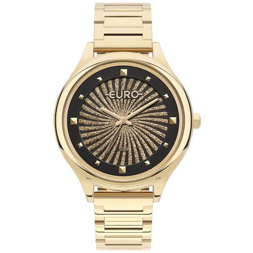 As Cores Estão em Alta A Euro continua seguindo tendências e, dessa vez, trouxe em seus modelos um mostrador com fundo de cores em alta no mundo fashion, que trazem um contraste diferenciado aos produtos. Para a Mulher Euro que prefere um look mais tradicional, essa versão do relógio dourado feminino da Euro é monocromática e apresenta aplicação de detalhes em glitter no index.