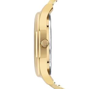 Relógio Euro Feminino Ref: Eu2033bb/4p Brilho Dourado As Cores Estão em Alta A Euro continua seguindo tendências e, dessa vez, trouxe em seus modelos um mostrador com fundo de cores em alta no mundo fashion, que trazem um contraste diferenciado aos produtos. Para a Mulher Euro que prefere um look mais tradicional, essa versão do relógio dourado feminino da Euro é monocromática e apresenta aplicação de detalhes em glitter no index. DESCRIÇÃO DO PRODUTO: Caixa de Metal Pulseira de Aço Vidro de Cristal Mineral Fundo Pressão Resistente à Água Até 5 Atm Diâmetro / Largura da Caixa: 42.00 MM Funções: Analógico Mostrador Preto com Glitter Alimentação do Maquinário: Bateria Maquina Japonesa de 1 Ano Marca: Não Informado
