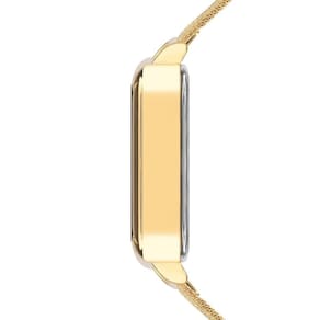 O destaque fica por conta do visor preto touch screen, onde as horas aparecem com um simples toque no botão inferior. A caixa de 32mm em acabamento dourado garante um visual elegante e feminino, enquanto a pulseira em aço tipo mesh traz leveza e conforto ao uso diário.