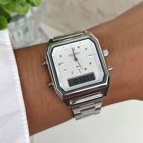Novas caixas de anadigi prometem fazer sucesso na coleção Fashion Fit Sporty. O modelo apresenta banho prata, caixa quadrada de 35mm, mostrador prata texturizado com marcação em todas as horas e módulo digital, trazendo duas tendências num modelo só: A vintage e logomania com o trabalho da logo da euro estampada no mostrador de forma diferenciada Gênero Feminino Largura da Caixa 3,5 Resistencia a agua 5 ATM Cor caixa Prata Material pulseira Aço 12 meses Cor caixa Prata Material pulseira Aço 12 meses Largura da Caixa 3,5 Resistencia a agua 5 AT