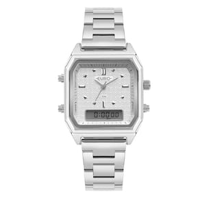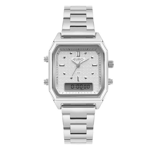 Novas caixas de anadigi prometem fazer sucesso na coleção Fashion Fit Sporty. O modelo apresenta banho prata, caixa quadrada de 35mm, mostrador prata texturizado com marcação em todas as horas e módulo digital, trazendo duas tendências num modelo só: A vintage e logomania com o trabalho da logo da euro estampada no mostrador de forma diferenciada Gênero Feminino Largura da Caixa 3,5 Resistencia a agua 5 ATM Cor caixa Prata Material pulseira Aço 12 meses Cor caixa Prata Material pulseira Aço 12 meses Largura da Caixa 3,5 Resistencia a agua 5 AT