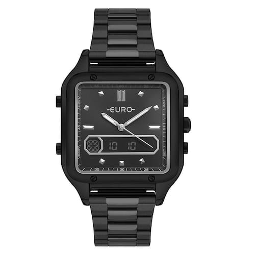 Relógio Euro Feminino Fashion Fit Sporty Preto - Eubj3890abc/4p A coleção Fashion Fit não para de crescer! Trazendo relógios que toda mulher Euro ama, lançamento apresenta nova versão do modelo best seller Anadigi nas cor preta. Cor da Caixa - Preto Material da Caixa - Aço Formato da Caixa - Quadrado Material da Pulseira - Aço Tipo de Fecho - Trava Lateral Garantia - 12 meses Cor do Mostrador - Preto Cor da Pulseira - Preto Descrição da Resistência - A resistência deste produto permite apenas respingos de água ao lavar as mãos. Não utilizar este produto em qualquer situação que haja contato direto com água.