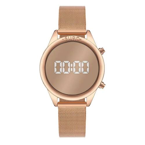 Estilo e elegância se unem no Relógio Euro FF Reflexos Rosé, uma peça que traduz modernidade com um toque delicado. Seu design minimalista destaca o mostrador espelhado rosé que revela o horário em dígitos brancos ao acionar os botões laterais, oferecendo uma leitura digital discreta e elegante.