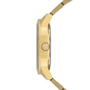 O mostrador dourado segue o mesmo padrão de textura da caixa, trazendo números romanos estilizados e ponteiros minimalistas, reforçando a sofisticação. A pulseira metálica com detalhe trabalhado une robustez e beleza, além de proporcionar um excelente ajuste ao pulso.
