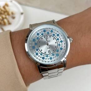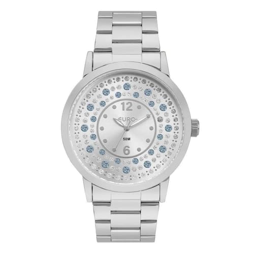 O modelo da coleção Glitz traz o banho prata com toques de Glitter no mostrador em prata e azul.
