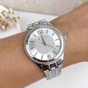 O mostrador em tom prata texturizado, com marcadores em relevo e destaque para os números 6 e 12, cria um efeito elegante e contemporâneo. Ideal para quem quer brilhar com estilo em qualquer ocasião.