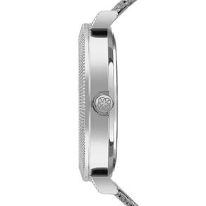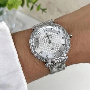 O mostrador prata exibe marcadores numéricos e cristais em destaque, sobre uma base central texturizada que adiciona profundidade ao design. A pulseira mesh prateada complementa o visual com delicadeza e conforto, ajustando-se perfeitamente ao pulso.