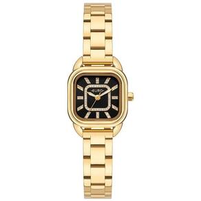 A coleção Mini não para de fazer sucesso! Modelo com caixa moderna e pequena quadrada, mostrador preto com detalhes de brilho e banho dourado.