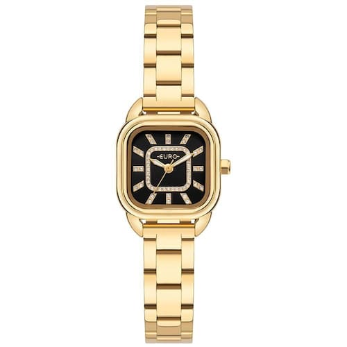 plaintext_description_meli - Relógio Euro Feminino Mini Dourado - EU2036YVG/4PA coleção Mini não para de fazer sucesso! Modelo com caixa moderna e pequena quadrada, mostrador preto com detalhes de brilho e banho dourado.