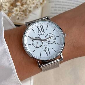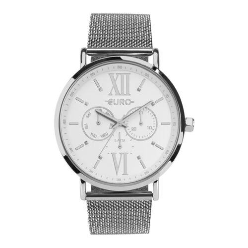 O Relógio Euro Multiglow Feminino na cor prata oferece um visual moderno e funcional em uma peça que transita facilmente entre o casual e o sofisticado. Seu design minimalista com mostrador branco e pulseira mesh traz leveza e elegância para o pulso.