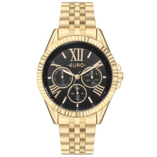 Relógio Euro Feminino Ref: Eu6p29aiv/4p Multifunção Dourado DESCRIÇÃO DO PRODUTO: Caixa de Metal Pulseira de Aço Inoxidável Vidro de Cristal Mineral Fundo Pressão Resistente à Água Até 5 Atm Diâmetro / Largura da Caixa: 38.00 MM Funções: Analógico, Multifunção Mostrador Preto com Algarismo Romano Alimentação do Maquinário: Bateria de 1 Ano Ean: 7891530866692