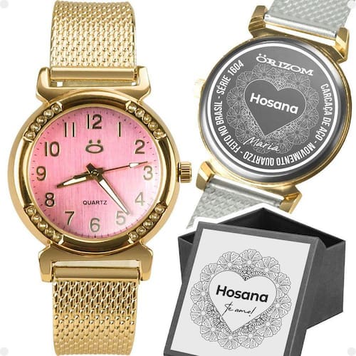 Surpreenda alguém especial com uma personalização única Adicione o nome da pessoa amada tanto na tampa do relógio quanto na caixa.